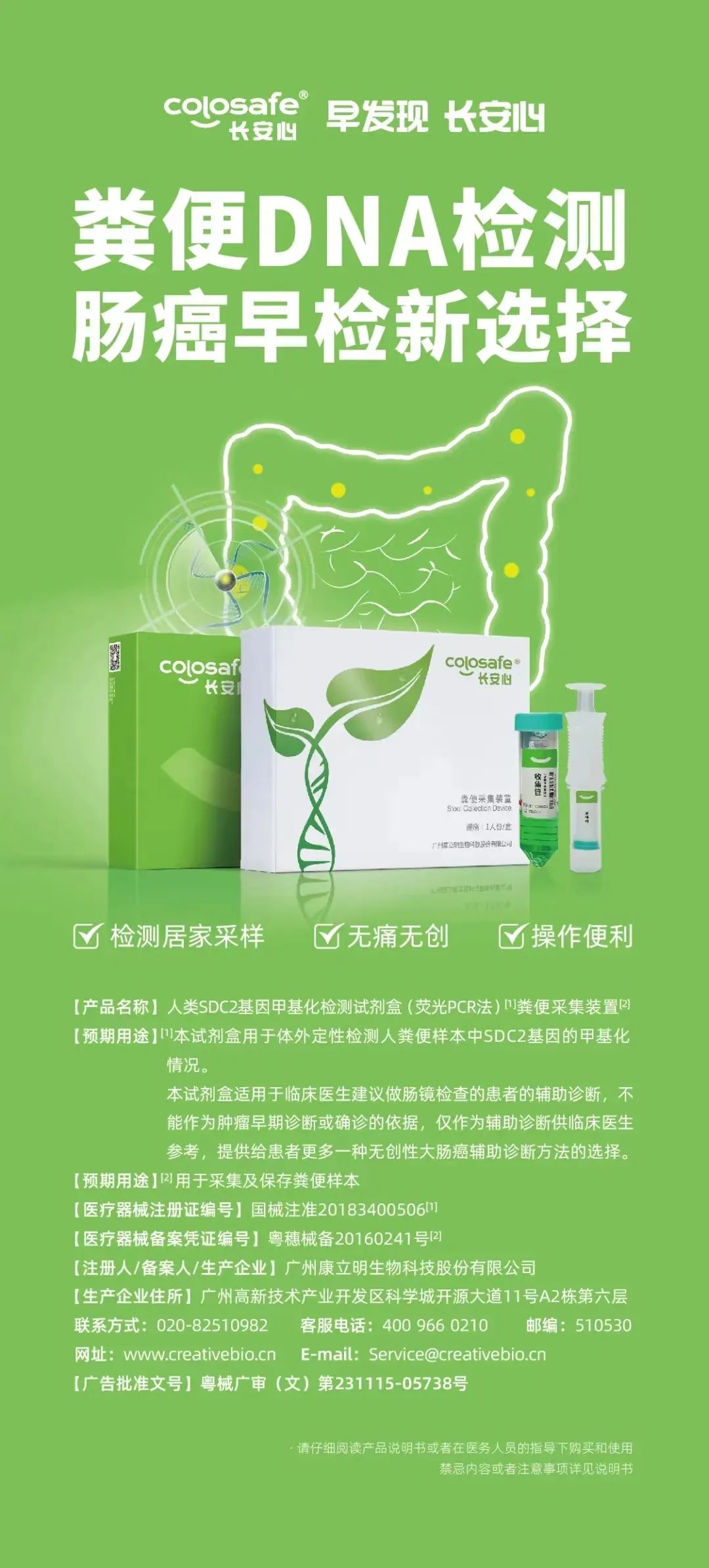 長(zhǎng)安心®人類(lèi)SDC2基因甲基化檢測(cè)試劑盒(熒光PCR法)于20181120日獲國(guó)家藥監(jiān)局頒發(fā)的三類(lèi)醫(yī)療器械注冊(cè)證書(shū),是中國(guó)率先獲批上市的腸癌糞便基因檢測(cè)試劑盒,成為國(guó)內(nèi)腸癌無(wú)創(chuàng)DNA檢測(cè)破冰之作。長(zhǎng)安心®糞便基因檢測(cè)通過(guò)解讀糞便中脫落腫瘤細(xì)胞的基因異常改變,幫助醫(yī)生發(fā)現(xiàn)患者早期腸癌病變情況,有希望將結(jié)直腸癌阻斷在早期階段,從而達(dá)到預(yù)防和根治結(jié)直腸癌的目的。