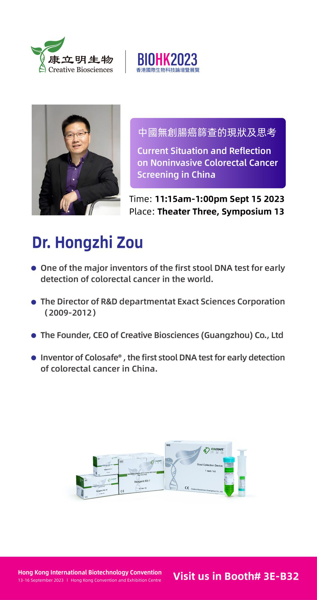 康立明生物受邀在本屆BIOHK2023的論壇上發(fā)表主題演講并在現(xiàn)場(chǎng)設(shè)立展位(Booth# 3E-B32),展示長(zhǎng)安心®腸癌糞便基因檢測(cè)等多個(gè)腫瘤早期檢測(cè)產(chǎn)品以及相關(guān)自動(dòng)化檢測(cè)設(shè)備,為當(dāng)下腫瘤疾病預(yù)防、個(gè)性化治療、疾病監(jiān)測(cè)管理、食品安全等不同需求提供可靠解決方案。歡迎各界朋友蒞臨現(xiàn)場(chǎng)交流,攜手創(chuàng)造新機(jī)遇。